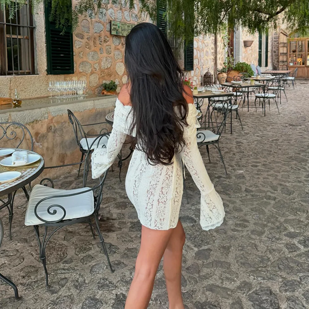 OEM/Wholesale Women's Elegant Lace Off Shoulder Trumpet Sleeve Sexy Bodycon Beige Slim Fit Casual Undefined Hot Mini Dress